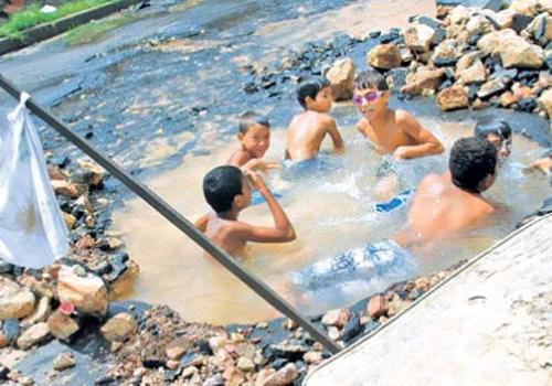 Enquanto isso, crianças da rua aproveitam a ?piscina? que se formou para tomar banho e brincar, com risco de se machucarem ou contraírem doenças.