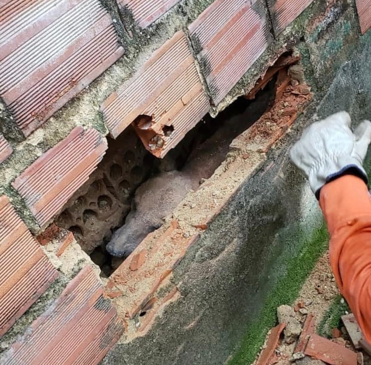 O Corpo de Bombeiros realizou o resgate de um cachorro na tarde de quinta-feira (07/05), que estava preso entre muros de duas residências do bairro Promorar, na zona Sul de Teresina.