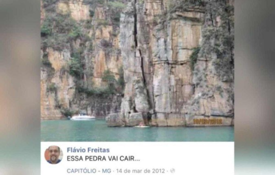 Dono de lancha e apaixonado por navegar em mares e lagos, o médico Flávio Freitas, de Ilhabela (SP), se mantém informado sobre notícias de acidentes náuticos em grupos no WhatsApp. Foi por um deles que ele soube da queda da rocha do paredão de cânion, em Capitólio (MG), neste sábado (8/1), que causou, até o momento, a morte de sete pessoas. Imediatamente, ele lembrou de quando esteve no local, em março de 2012, e viu a fenda. Na ocasião, ele registrou, no perfil do Facebook, o perigo e determinou: “essa pedra vai cair”. Hoje, ele compartilhou a foto e lamentou que a “previsão” estava correta.