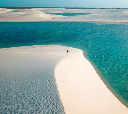 O Parque Nacional dos Lençóis Maranhenses é um lugar abençoado pelas forças da natureza. Uma experiência única proporcionada por um deserto de águas, onde o contraste da areia branca, fininha, encontra a exuberância da água destilada das chuvas. O resultado é um grande balneário de lagoas de água tão azul que nem parece que é de verdade.