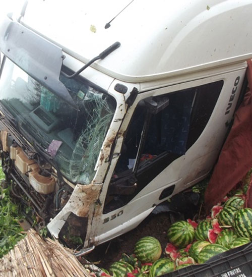 Por sorte, o condutor não se feriu, houve apenas danos materiais e a carga de frutas e verduras acabou se espalhando parcialmente na pista e nas margens da rodovia.