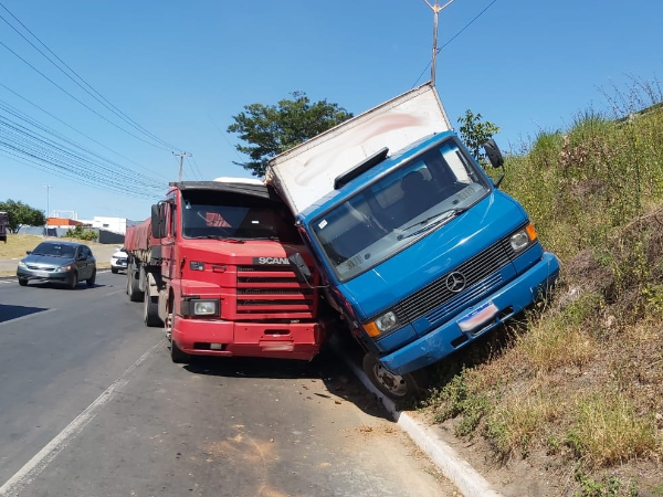 Com o impacto, o caminhão baú foi jogado para cima do canteiro e teve muitas avarias, assim como o carro de passeio.