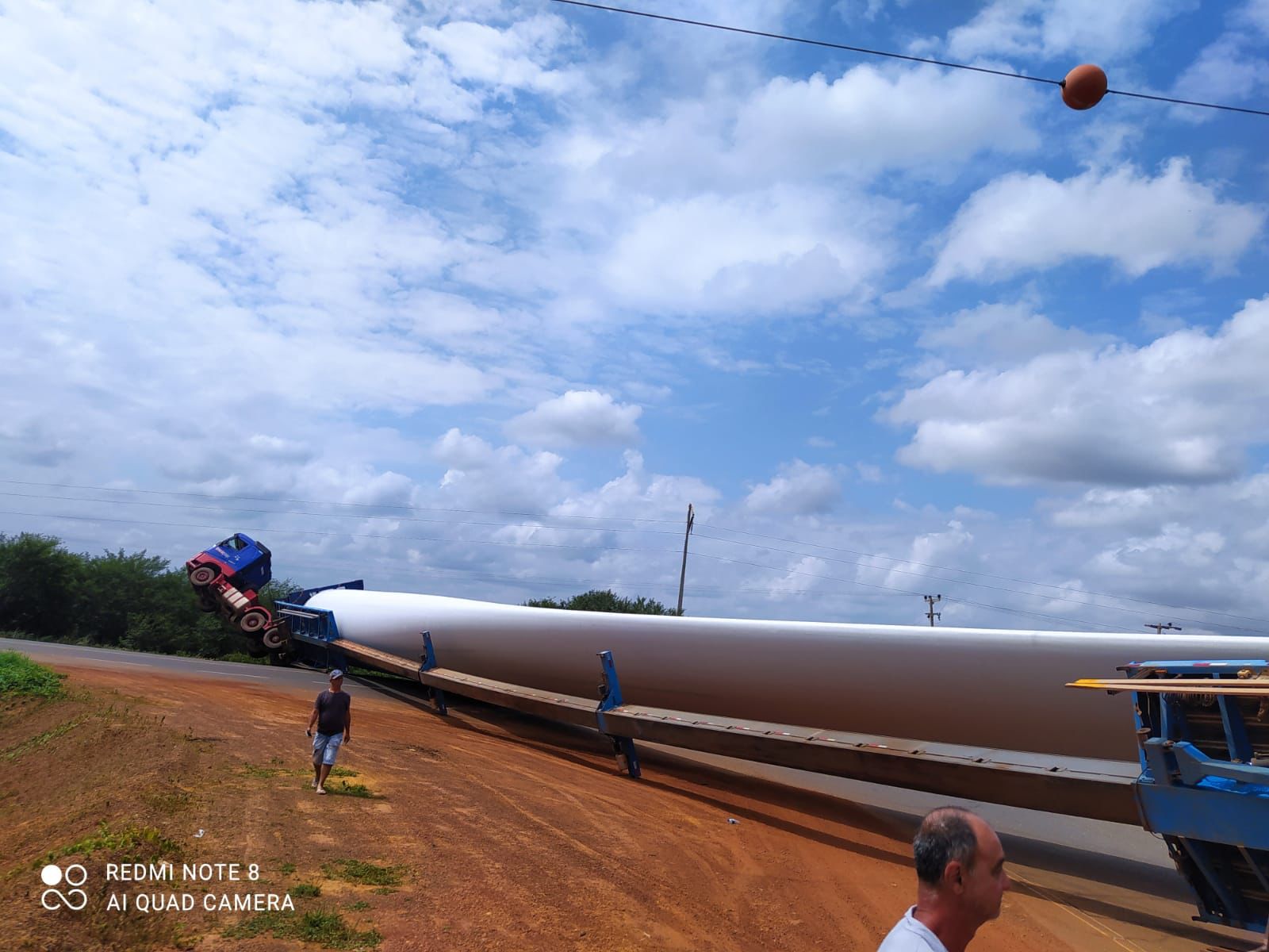 O veículo, que transportava uma pá eólica, tombou ao tentar realizar uma manobra de conversão na BR 020. O evento interditou totalmente a rodovia e não há previsão de liberação.