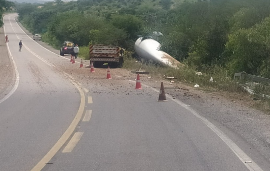Uma carreta transportando uma pá eólica tombou na manhã desta quarta-feira (16), interditando o tráfego de veículos na BR-407, entre os municípios de Patos do Piauí e Jacobina do Piauí. O acidente, de acordo com a Polícia Rodoviária Federal (PRF), aconteceu por volta das 09h30, no Km 509.