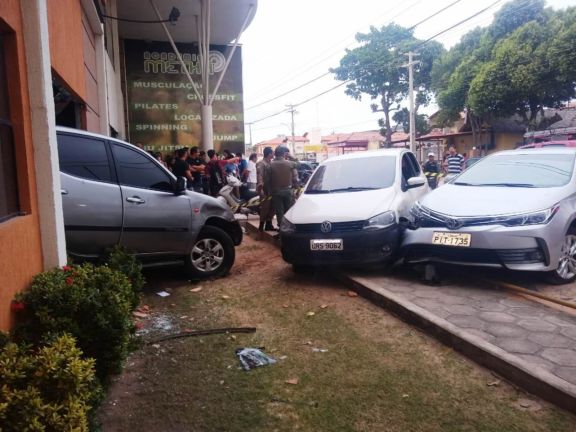 Um veículo modelo L 200 Triton, invadiu a ala interna da academia Metha e atingiu dois carros no estacionamento, um Polo e um Corola.