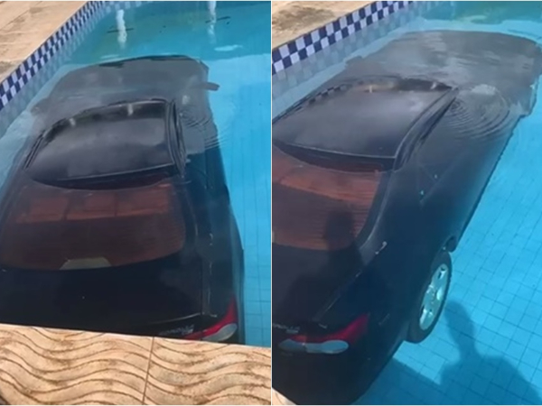 As duas pessoas que banhavam na piscina não foram atingidas. No vídeo, é possível ver elas se afastando, após o carro cair na água.