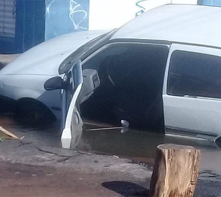 De acordo com testemunhas, o condutor ia passando pela rua, quando a via rompeu e abriu um buraco, deixando o carro preso.