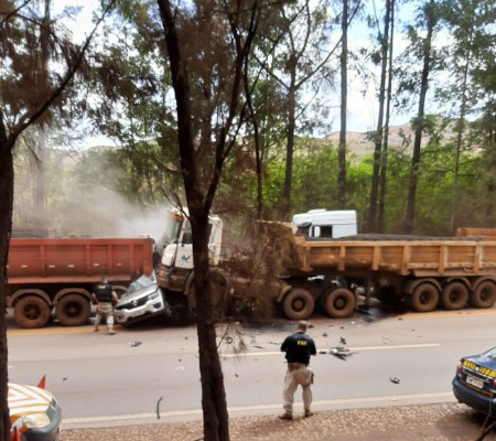 Um automóvel ficou prensado entre duas carretas na tarde desta sexta-feira (6) BR-040, em Congonhas, na Região Central de Minas Gerais. Quatro veículos se envolveram no engavetamento, que deixou uma pessoa morta.