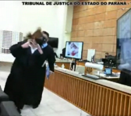 O advogado Cláudio Dalledone balançou o pescoço de uma colega e empurrou a advogada ao simular uma agressão durante julgamento realizado na última segunda-feira, 10 de maio, em Guarapuava, Paraná. As cenas estão repercutindo nas redes sociais.