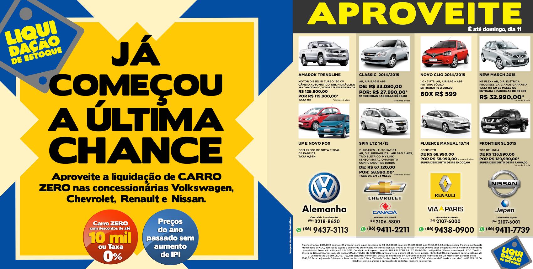 Uma super liquidação promete movimentar o mercado automotivo piauiense já nestes primeiros dias de 2015. Já começou a Liquidação de Estoque nas concessionárias Chevrolet, Volkswagen, Renault e Nissan.