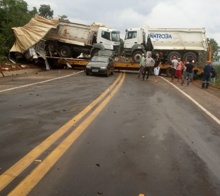 Uma colisão envolvendo um caminhão baú e uma carreta que transportava dois caminhões caçamba deixou a rodovia BR-135 completamente interditada no final da  tarde desta sexta-feira (26/02), na altura do km 560, na descida da Serra da Santa Marta, na zona rural do município de Corrente, região Sul do Piauí.