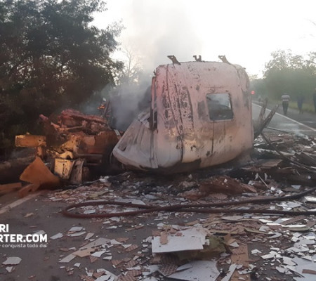 O impacto provocou um incêndio que ocorreu na carreta com cerâmica. O motorista do veículo teve ferimentos graves.