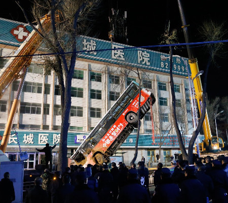 Imagens exibidas pela mídia estatal chinesa mostram o coletivo caindo na cratera, que chegou a cerca de 80 metros quadrados na cidade de Xining.