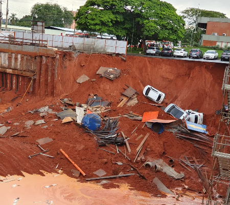 Os carros foram engolidos depois que a terra cedeu durante a chuva que caiu nesta tarde, por volta das 15h30. Um trecho de asfalto, onde os carros estavam estacionados, foi abaixo. No local, havia uma obra para a construção de um prédio.