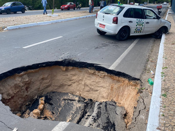 Uma cratera se abriu em um trecho da Avenida Maranhão, no início da tarde desta quinta-feira (27), nas proximidades do Iate Clube, na zona centro Norte de Teresina. Um taxista que ia passando no momento bateu no buraco e colidiu na sequência em uma calçada.