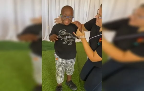 Nas imagens, compartilhadas pela ONG Atos Angola, uma das voluntárias do projeto coloca os óculos no menino pela primeira vez.
