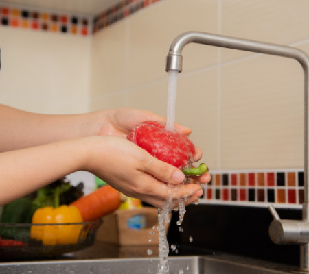 Frutas, verduras e legumes crus devem ser lavados em água corrente e mergulhados em recipiente com água sanitária diluída em água. Importante: veja se o rótulo da água sanitária descreve as instruções de uso para deixar o alimento em imersão. Caso não tenha essa informação, utilize de outra marca, pois nem todas as águas sanitárias são próprias para esse fim. Não lave as frutas antes de armazená-las, e sim, antes do consumo, para não correr o risco de estragarem rápido.