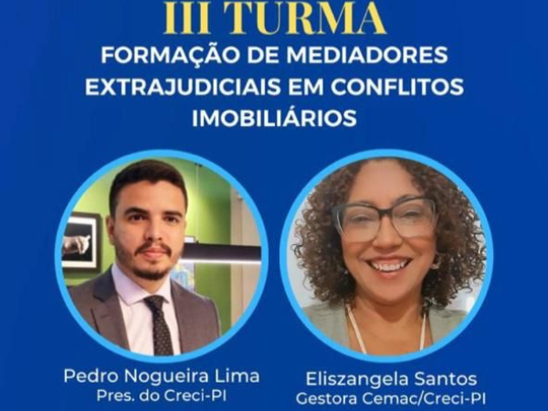 As inscrições para o curso de Formação de Mediadores Extrajudiciais em Conflitos Imobiliários encerram hoje. Nesta quarta-feira (15), acontece a live de abertura das aulas, que será transmitida através do perfil do Conselho Regional de Corretores de Imóveis do Piauí (instagram: @crecipi), a partir das 18h.