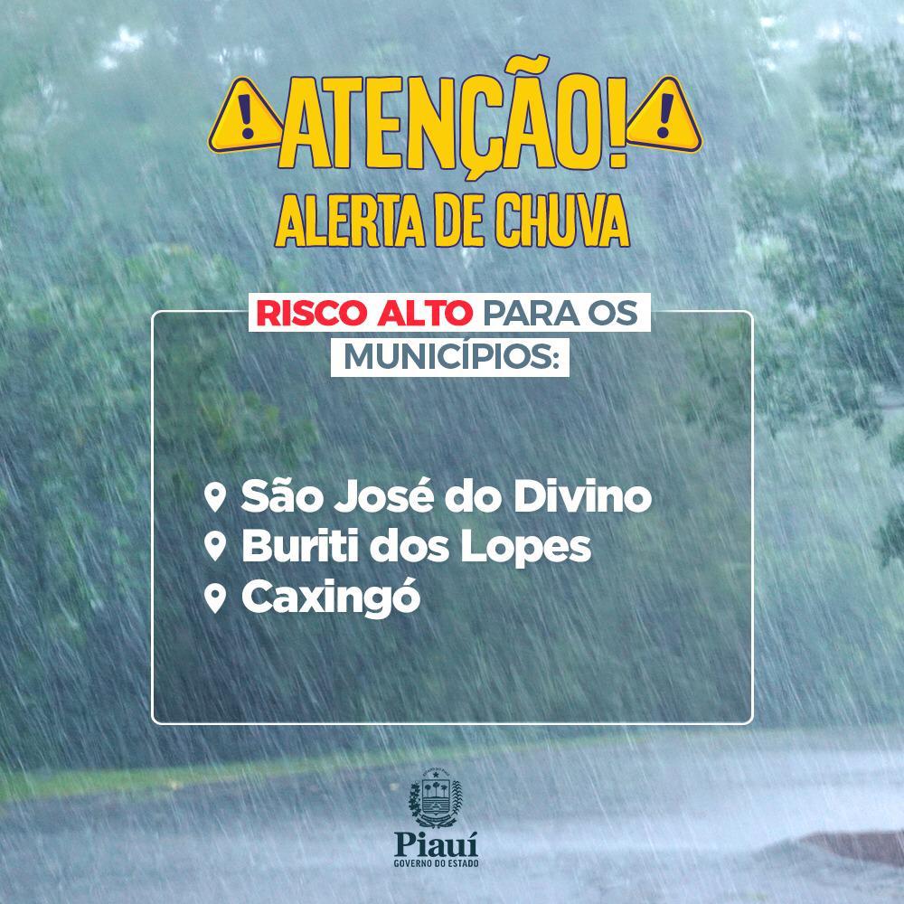 A Secretaria de Estado da Defesa Civil divulga o alerta de “risco alto” em três municípios do Piauí: Buriti dos Lopes, São José do Divino e Caxingó. Há risco de inundações e enxurradas, principalmente, para as comunidades ribeirinhas. Os dados foram divulgados na noite dessa terça-feira (10) pelo Centro Nacional de Monitoramento de Desastres Naturais.