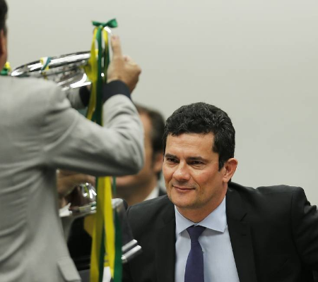 O ministro da Justiça Sérgio Moro foi presenteado com um troféu na noite desta terça-feira, durante a sessão da qual participa na Comissão de Constituição e Justiça (CCJ) da Câmara dos Deputados. Ao receber o "prêmio", o ex-juiz falava há mais de 7h aos parlamentares sobre as mensagens atribuídas a ele e ao procurador Deltan Dallagnol, coordenador da força-tarefa da Operação Lava-Jato. As informações são do OGlobo.