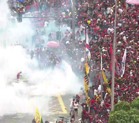 A Polícia Militar lançou bombas de gás para dispersar a multidão após o trio elétrico que levava o time do Flamengo deixar a Avenida Presidente Vargas, na altura do monumento a Zumbi dos Palmares.