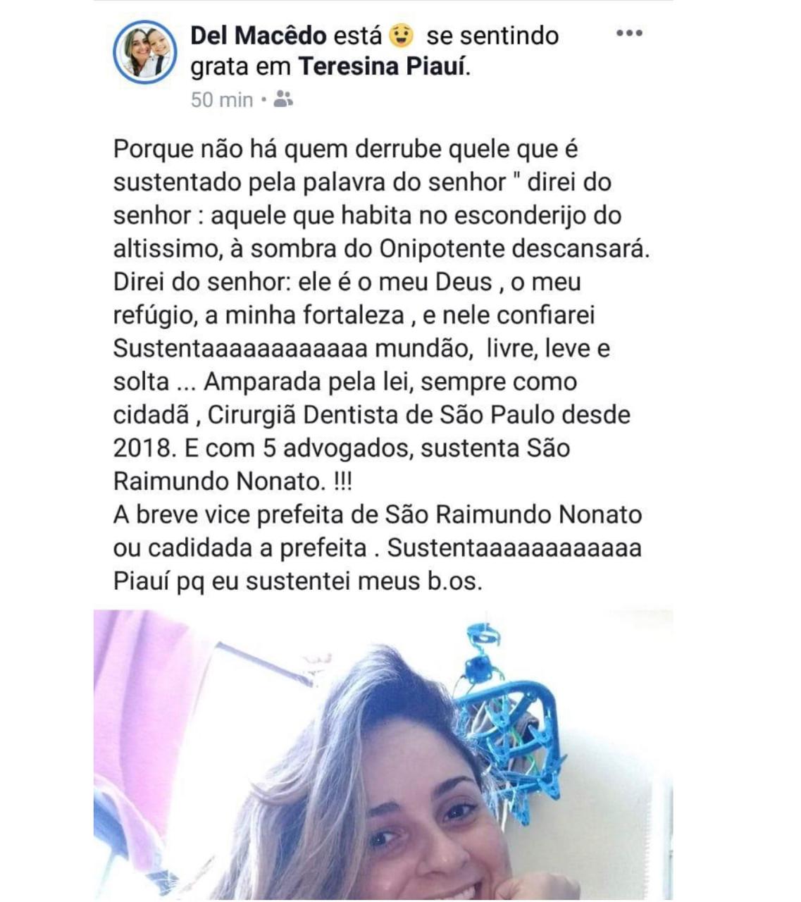 Em outro trecho da postagem, ela diz: ‘A breve vice-prefeita de São Raimundo Nonato ou candidata a prefeita. Sustenta Piauí porque sustentei os meus B.Os’.