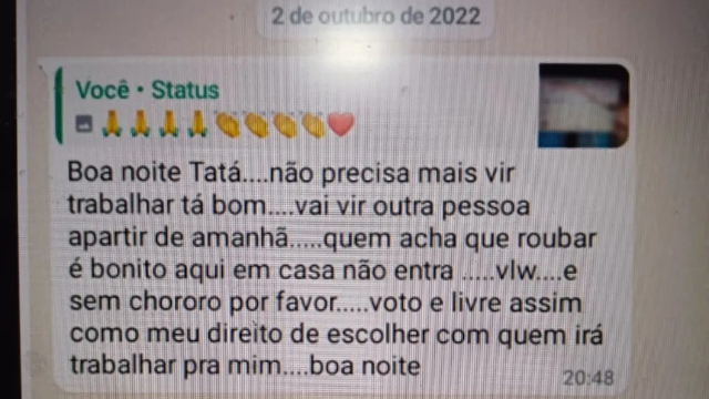"Boa noite, Tatá. Não precisa mais vir trabalhar, tá bom? Vai vir outra pessoa a partir de amanhã... quem acha que roubar é bonito aqui em casa não entra.....vlw....e sem chororô por favor. Voto é livre assim como meu direito de escolher quem irá trabalhar pra mim. Boa noite", disse o empregador em mensagem enviada à diarista.