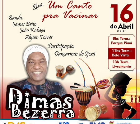 O cantor e compositor piauiense Dimas Bezerra realiza o projeto “Semeando Cultura Afro-Brasileira e Cidadania”. Serão apresentações culturais com músicas e danças afro-brasileiras, além de palestras com temas variados sempre sob a ótica da pandemia de Covid-19.