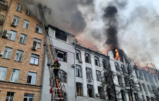 Pelo menos dois prédios pegaram fogo, e parte de um dos edifícios desabou em Kharkiv nesta quarta-feira (2).