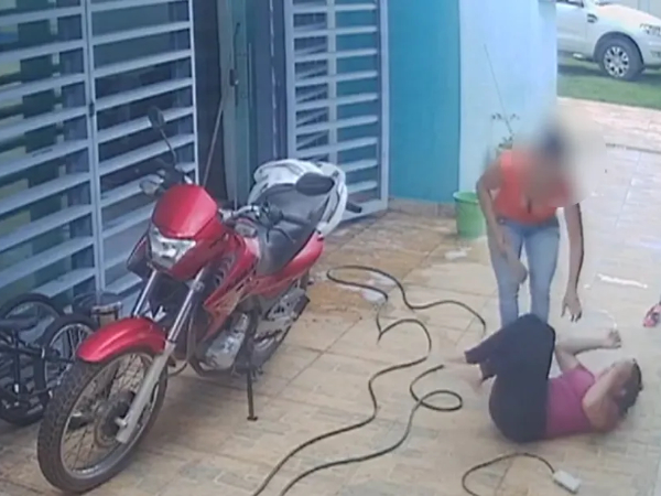 O vídeo da câmera de segurança mostra o momento do acidente. Luciana estava na casa onde trabalha quando levou o choque. Ela pegou uma extensão para lavar o quintal, mas o fio estava desencapado.