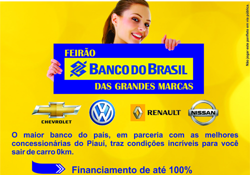 Hoje é o último dia para quem quer aproveitar o Feirão Banco do Brasil das Grandes Marcas que está acontecendo nas concessionárias Chevrolet (Canadá Veículos); Volkswagen (Alemanha Veículos) Renault (Via Paris) e Nissan (Japan Veículos). O atendimento neste sábado será até às 18h.