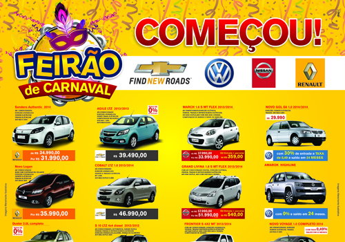 Começa hoje nas concessionárias das marcas Chevrolet, Volkswagen, Renault e Nissan o Feirão de Carnaval que oferece financiamento sem juros e parcelas a partir de R$ 359,00 para quem quer comprar um carro seminovo OKm com as melhores condições do mercado.