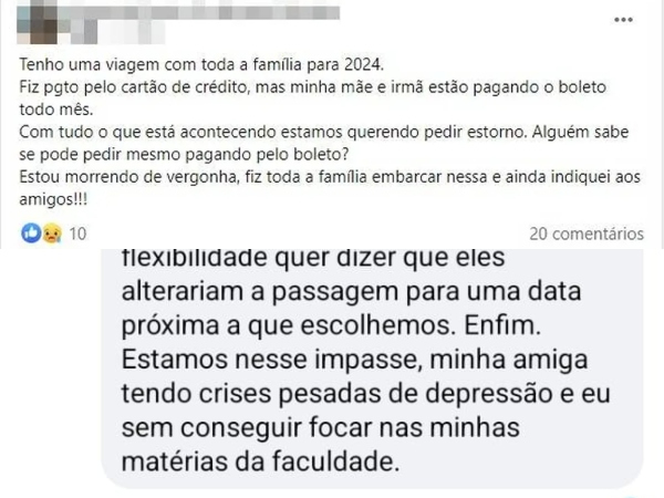 O sentimento de 'vergonha' também está presente nas mensagens do Grupo Prejudicados pelo Hotel Urbano. "Tenho uma viagem com toda a família para 2024. Fiz o pagamento pelo cartão de crédito, mas minha mãe e irmã estão pagando o boleto todo mês. Com tudo o que está acontecendo estamos querendo pedir estorno. Alguém sabe se pode pedir mesmo pagando pelo boleto? Estou morrendo de vergonha, fiz toda a família embarcar nessa e ainda indiquei aos amigos", pontua outra.