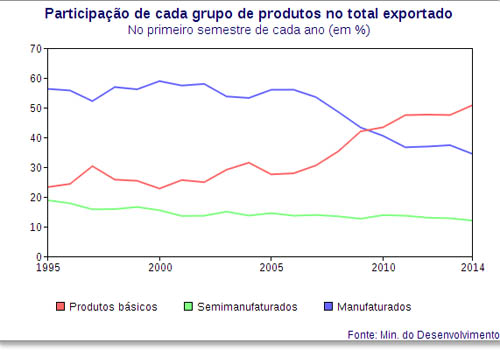 No primeiro semestre de 2002, os produtos básicos corresponderam a 25% das exportações brasileiras, enquanto os industrializados ficaram com 75%. Já na primeira metade de 2014, mais da metade (50,8%) das vendas ao exterior foram de mercadorias básicas.
