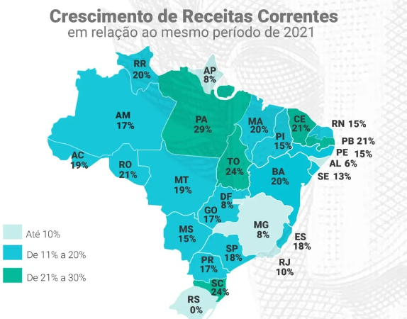 Pará, Santa Catarina e Tocantins lideraram o ranking de estados com maiores crescimentos em suas receitas correntes em relação ao mesmo período de 2021. No entanto, Roraima, Rondônia e Ceará tiveram o maior crescimento de despesas correntes.