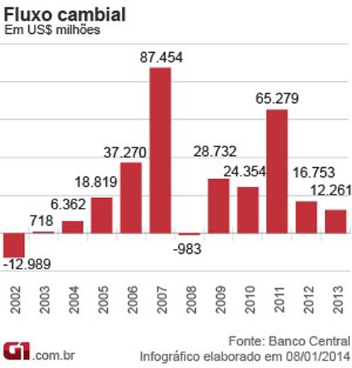 Pela primeira vez em cinco anos, mais dólares saíram do que entraram no Brasil em 2013. O chamado fluxo cambial ficou negativo em US$ 12,26 bilhões no ano passado, segundo dados divulgados nesta quarta-feira (8) pelo Banco Central. Em 2008, último ano de fluxo negativo até então, o volume da moeda estrangeira que deixou o país foi US$ 983 milhões maior que aquele que chegou, efeito da primeira etapa da crise financeira internacional.