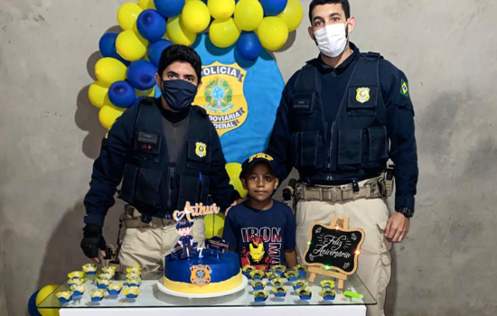 O garoto Arthur Emanuel que é fã da PRF, ganhou uma festa temática que contou com a presença de policiais em seu aniversário de 7 anos.