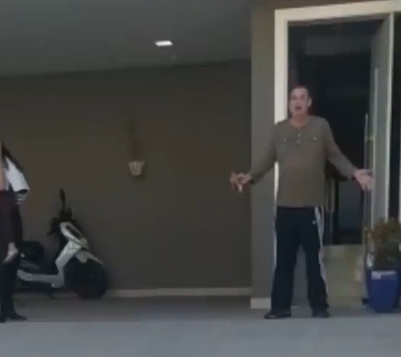 Enquanto isso, a mulher dele diz algo ininteligível e sai da casa com a criança no colo, ficando na garagem. O comerciante fica parado na porta da casa falando ao telefone: