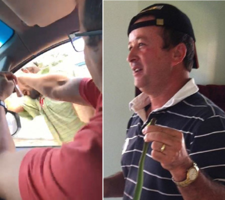 Com uma nota de R$ 5 na mão, Adonias pede para que o homem chegue mais perto. Neste momento, lhe dá um tapa no rosto, e diz: “vai trabalhar, vagabundo!”. O pedinte fica sem reação.