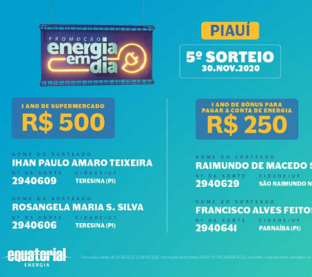 A Equatorial Piauí realizou a apuração dos números da sorte divulgados pelo sorteio da Lotomania realizado no dia 30 de novembro e, após auditoria, apresenta hoje (11), os 04 ganhadores do 5º sorteio da promoção Energia em Dia.