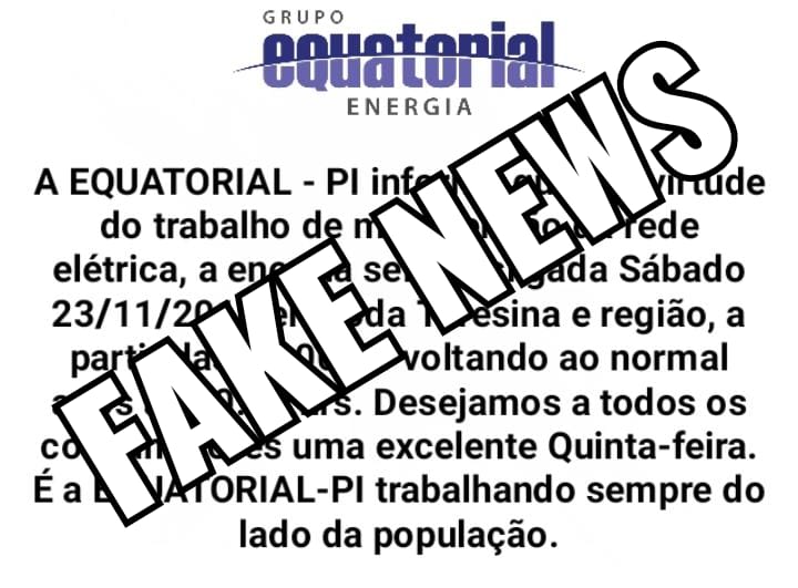 A Equatorial Piauí informa que é falsa a informação de que a empresa faria desligamento programado no próximo sábado, 23, das 16h às 20h, em Teresina ou qualquer outro município.