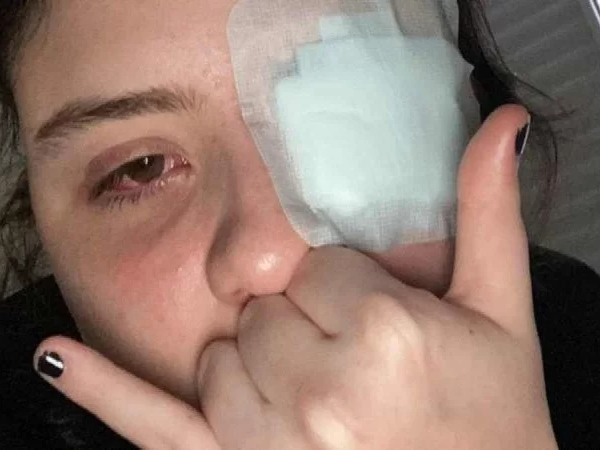 Como a dor e a ardência continuaram, o namorado a levou a uma farmácia, onde lavou os olhos com soro fisiológico.