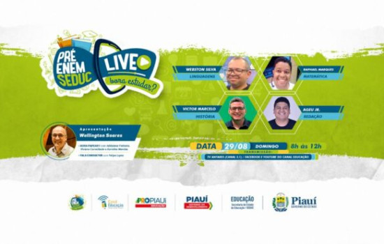 A programação segue no domingo (25) com a revisão Pré-Enem Live que têm como marca as interações entre professores e estudantes no chat de transmissão. Sob apresentação do professor Wellington Soares, a revisão será transmitida pelo TV Antares (Canal 2.1), Facebok e Youtube do Canal Educação e será realizada das 8h às 12h.