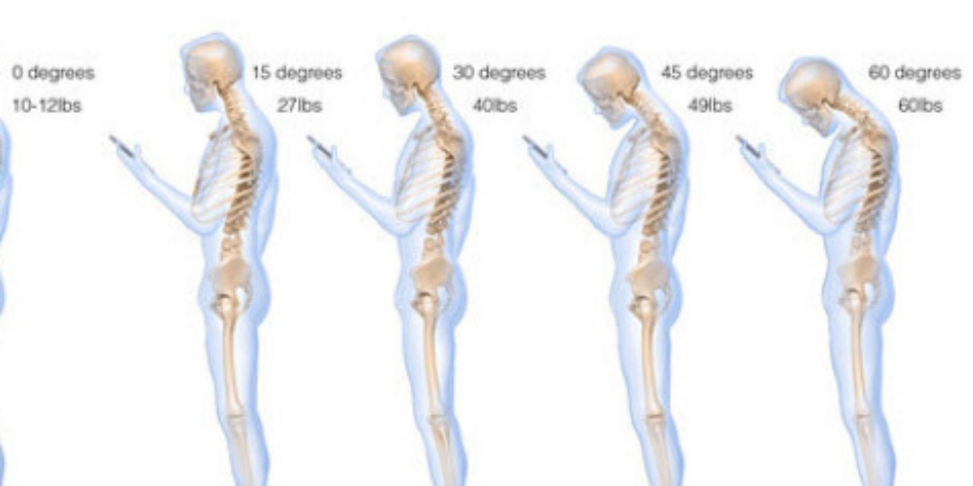 “À medida que a cabeça se inclina para a frente as forças visto pelo pescoço sobe para 12kg a 15 graus, 18 kg a 30 graus, 22 kg a 45 graus, e 27 kg a 60 graus”, escreveu Hansraj. Segundo a Health, além do uso das redes sociais, as pessoas passam de duas a quatro horas por dia com a cabeça apontada para baixo, geralmente lendo textos ou usando aplicativos. Em um ano, estamos falando de 700 a 1.400 horas de peso em excesso sobre o pescoço.