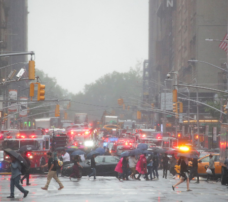 Equipes de resgate estão no local. Chove muito em Nova York.
