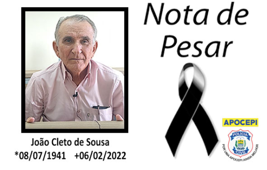 “É com imenso pesar que a diretoria da Apocepi comunica o falecimento do ex-presidente e um dos fundadores da Apocepi, Delegado João Cleto de Sousa, aos 80 anos. Era filho de João Cleto de Sousa e Úrsula Campos de Sousa. Nascido em Altos-PI, em 8 de julho de 1941. Muita força e paz para a família e os amigos e que Deus conceda descanso eterno ao amigo e sempre presidente da Apocepi João Cleto de Sousa”, diz a nota de pesar.
