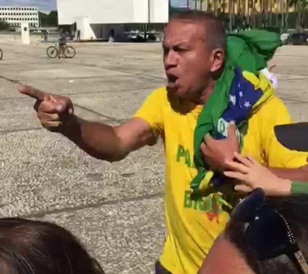 O apoiador de Bolsonaro afirma que foi "ameaçado" por órgãos de segurança. Na Praça dos Três Poderes, ele afirma que vive em uma "ditadura comunista" e chama autoridades de "bandidos".