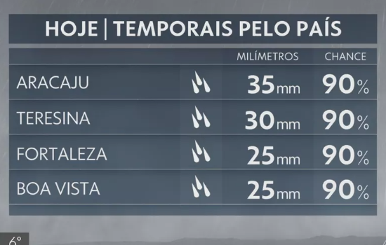 Cidades como Teresina, Aracaju e Fortaleza terão chance de 90% de chuva e são esperados até 35mm de água