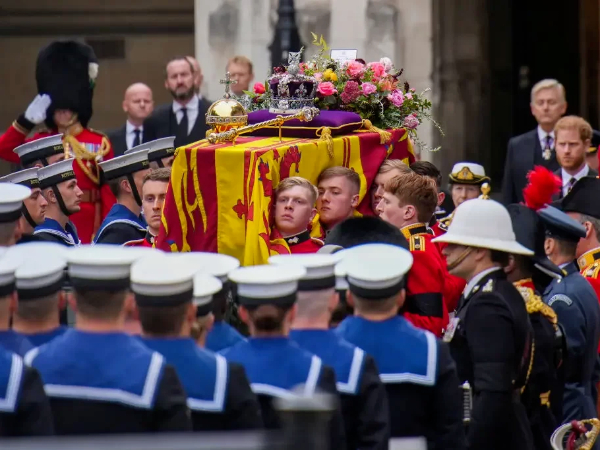 Nos momentos finais do cortejo para o funeral, o joalheiro da coroa removeu a coroa do Estado imperial, o orbe e o cetro da rainha, que estavam apoiados em cima do caixão, e os pôs no altar. O gesto é um símbolo da passagem do trono para o novo rei, Charles III.