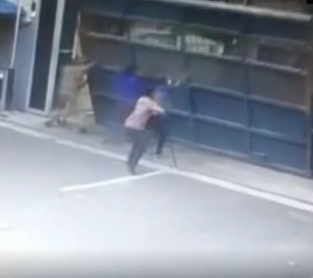 Nas imagens, um grupo de operários e funcionários do local tenta desemperrar o portão de entrada da empresa, quando as rodas descarrilam, e o portão de 4,5 metros despenca, atingindo dois homens.